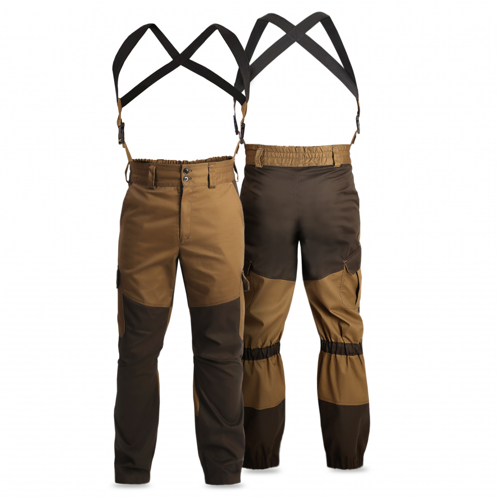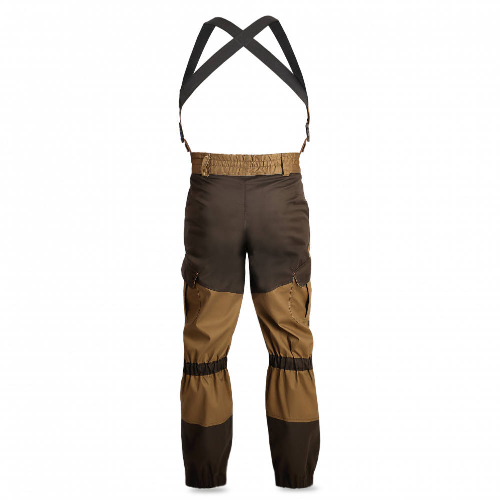 Брюки с центральной застёжкой на замок «молния» и шлевками под ремень, 2-е боковые шлёвки длиннее, для закрепления фастекса и бретелей. Бретели из помочной ленты.